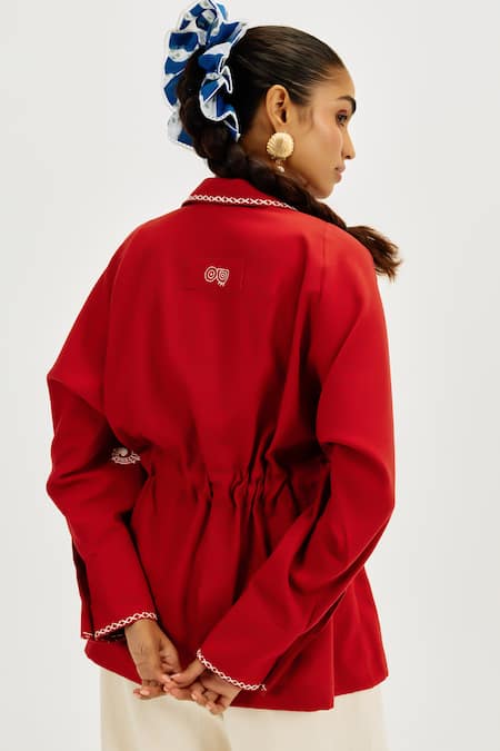 Red Cotton Embroidery Collared Oro Handloom Shacket