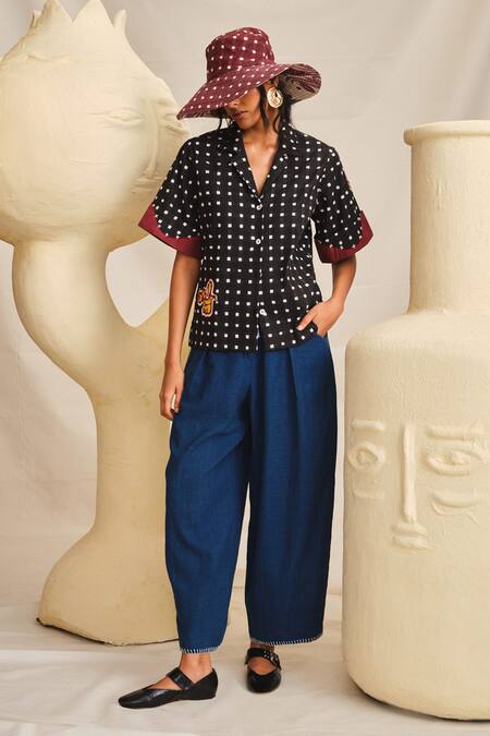 Black Muslin Embroidery Collared Pipli Checkered Applique Shirt
