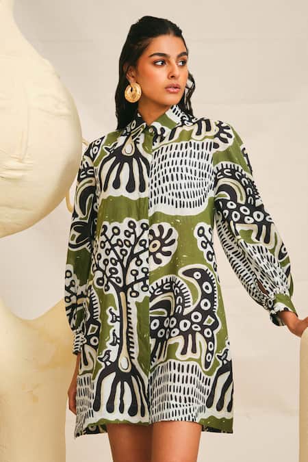 Green dress featuring Sohrai painting handblock print and puffed sleeves