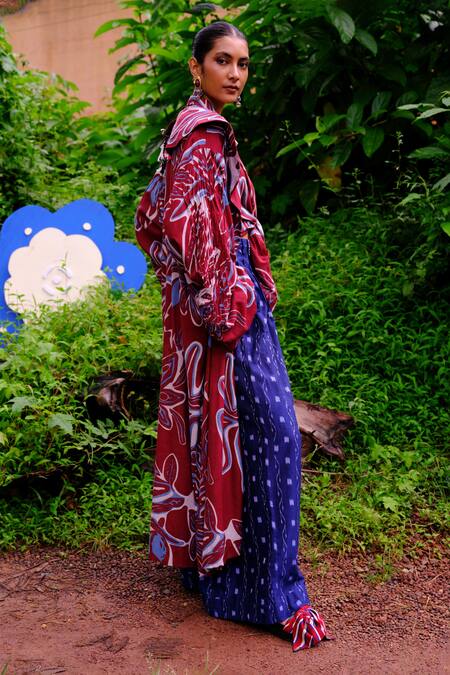 Blue wide leg trouser featuring handwoven ikat pattern and hand embroidered pockets