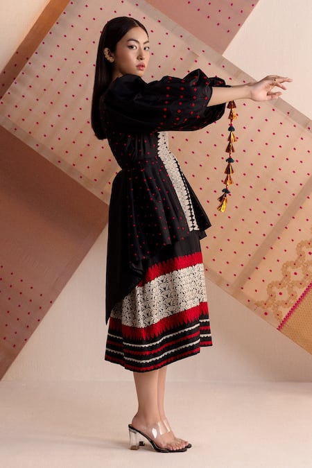 Black mulberry silk double layered structured coat dress featuring pleated fan detailing and threadwork handwoven floral border in the hem and front