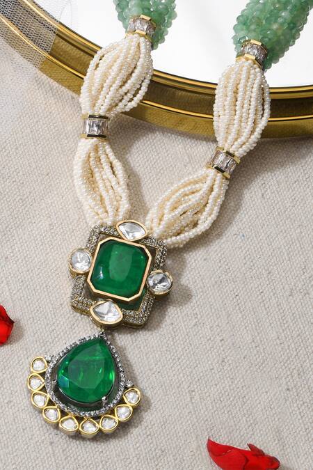 Gold finish tear drop carved pendant, Multi color stone & bead embellishment, Intricate detailing with green and cream beads