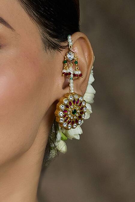 Floral motif design with kundan stones, Delicate pearl ear chain, Ruby red and emerald green stone accents