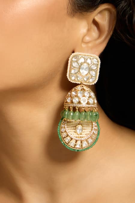 Green Stones, Diamonds Bead And Polki Embellished Earrings