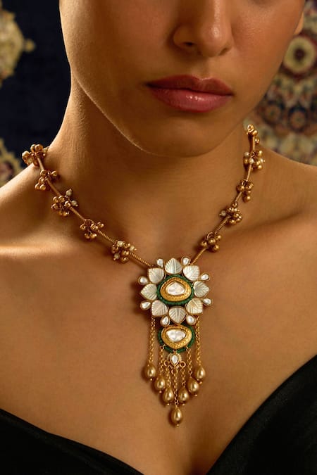 Gold necklace featuring a floral carved pendant embellished with stones and beads