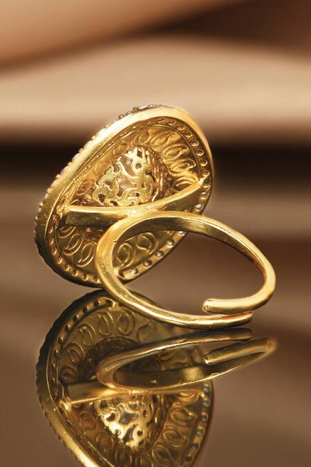 Central polki stone with a surrounding of red stones, Gold finish with intricate detailing