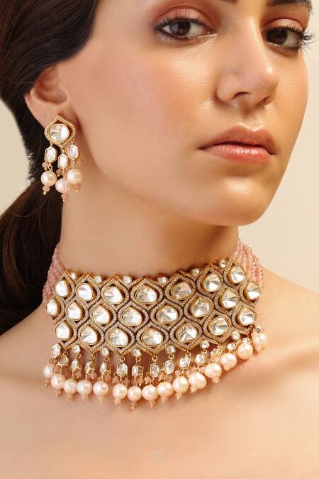 Gold plated with intricate stone work, Pearl drop accents on earrings, Choker style with layered design