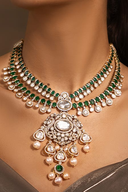 Gold finish double layered necklace featuring a carved floret pendant adorned with golden and green stone embellishments