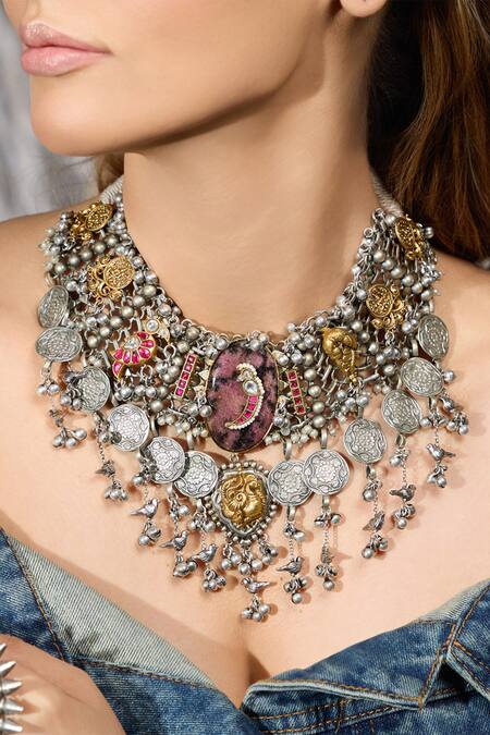 This oxidized silver necklace features floral gold accents, intricate danglers, and a central oval-shaped stone with an embellished crescent motif.