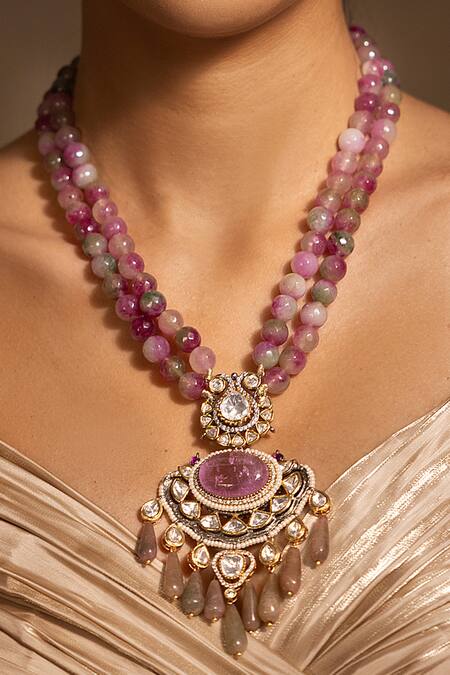 Pink Charming Stone Studded Tassel Pendant Necklace