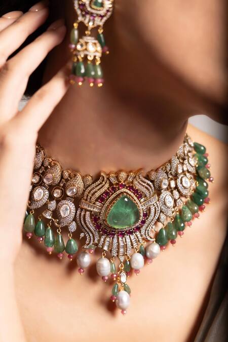 Green Gemstones, Pearls Chinmaya Necklace Set