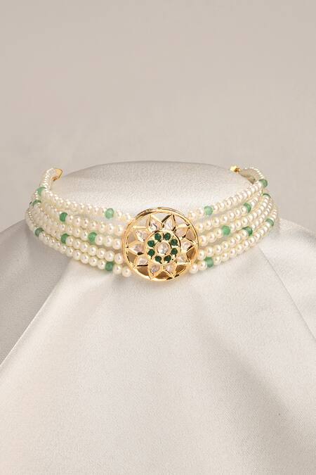 Gold finish floral carved choker featuring stone embellishments and white pearl strings
