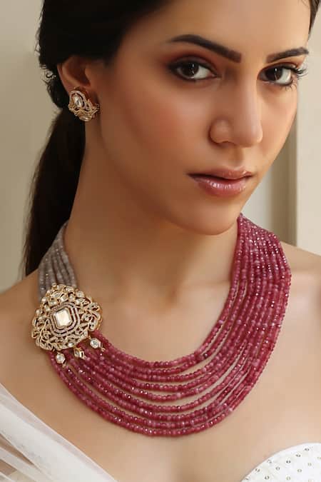 Pink Stones, Beads Gold Finish Embellished Necklace Set