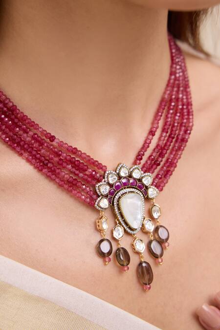 Multi-layered design with maroon stone accents, Intricate central pendant with mixed stones, Gold finish plating for enhanced elegance
