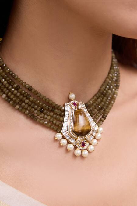 Designer choker necklace featuring a green main stone with pearl embellishments. Accompanied by matching earrings with a green stone and pearl detail.