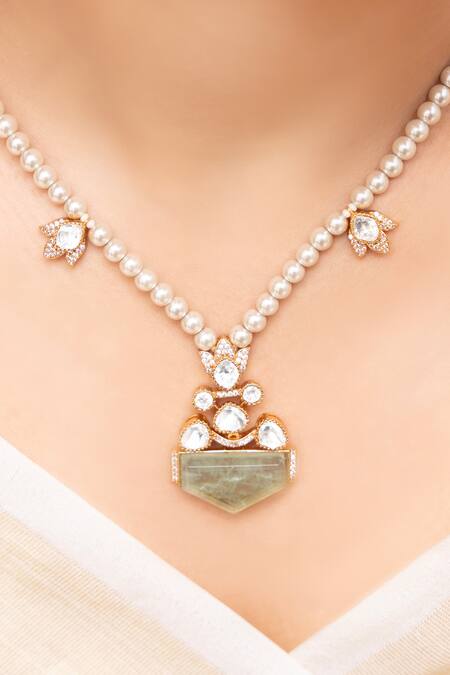 Green designer necklace set featuring a statement pendant with pearl embellishments. Paired with matching earrings adorned with similar motifs.