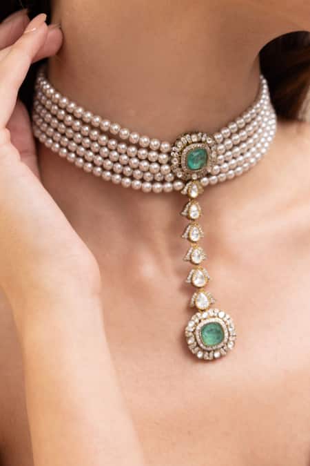 Choker design with layered pearl strands, Central pendant featuring a green stone, Drop embellishments with pear-shaped stones