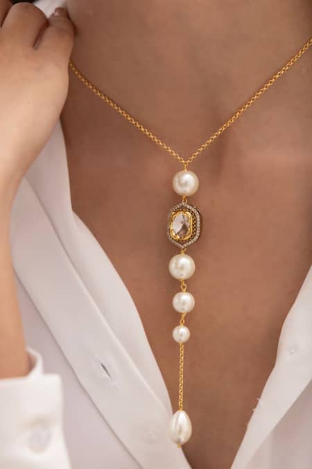 Central pendant with clear stone, Multiple pearl accents, Gold finish chain design