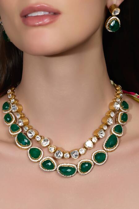 Two-layer necklace design, Emerald-green stones, Crystal embellishments