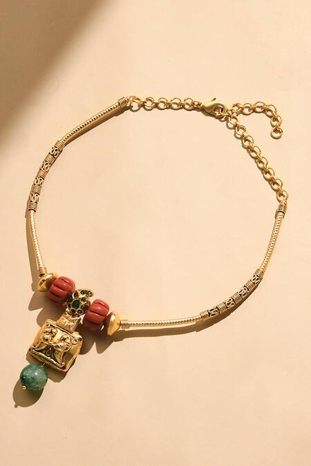 Gold finish stiff wire choker necklace featuring a bird carved multicolor stone embellished pendant
