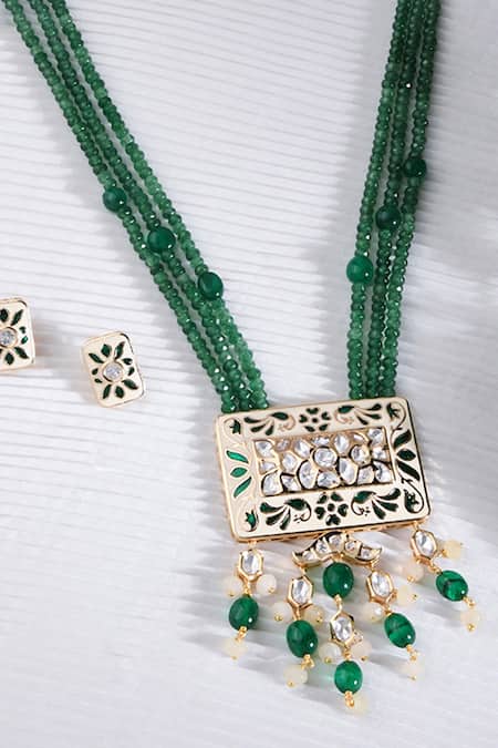 Gold finish green bead necklace featuring a floral motif, stone studded square center motif, and bead tassels. Paired with matching earrings that complement the necklace design.