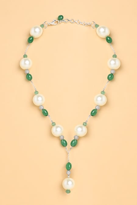 Gold lariat necklace featuring ethereal pearls, jade stones, and diamond stimulants