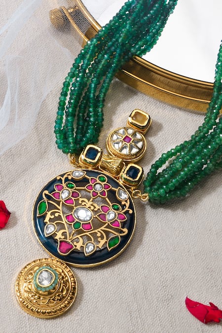 Gold finish pendant necklace featuring a Mughal bagh design with green toned stones and kundan embellishments