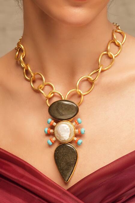 Gold finish geometric carved pendant necklace featuring black stone embellishments. Dimensions of the necklace are 48 x 3.5 x 1 cm with a lobster closure.