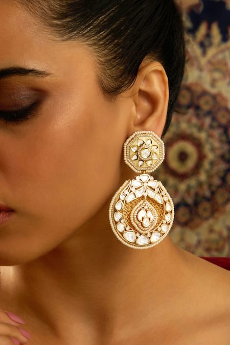 Intricate brass detailing with Polki stones, Unique chaandbali shape, Gold finish for a luxurious appearance