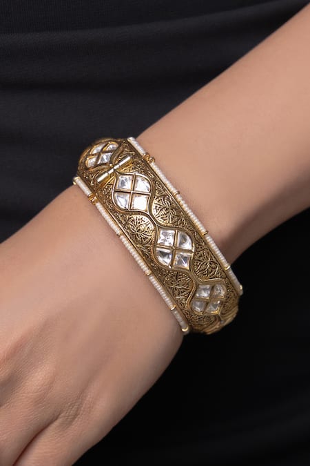 A pair of gold-toned brass bangles featuring intricate golden patterns and shimmering clear crystals. The bangles are adorned with delicate white pearl-like beads along the edges.