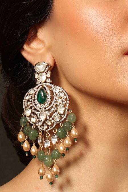 Green dangler earrings featuring intricate Kundan and Polki embellishments with bead drops