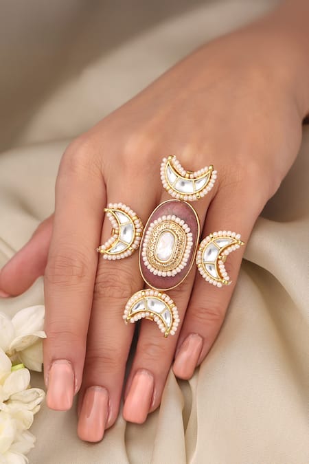 Central oval-shaped dusty rose pink stone, Four crescent moon-shaped kundan pieces, Small white bead embellishments