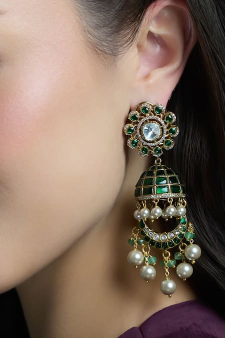 Green and gold jhumka earrings featuring kundan and pearl detailing.