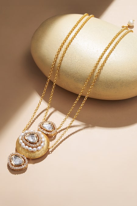 Gold plated chain with freshwater pearl highlights, Polki and kundan detailing, Unique pendant design