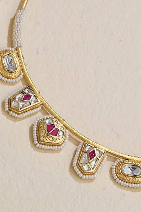 Gold choker necklace featuring intricate kundan stone and pearl embellishments