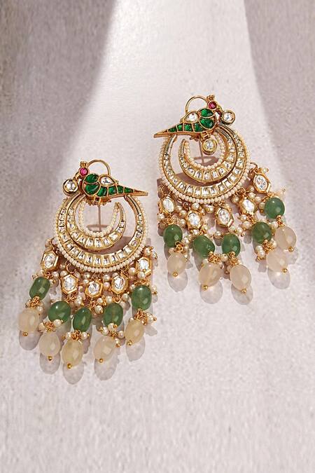 Gold finish chandbalis featuring a bird shape motif adorned with hydro ruby, emerald, classic pearls, jade beads, agates, kundan, and polki embellishments