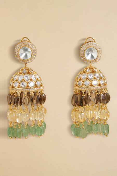 Multi color jhumka earrings featuring polkis, kundan, agate beads, and jade tumbles