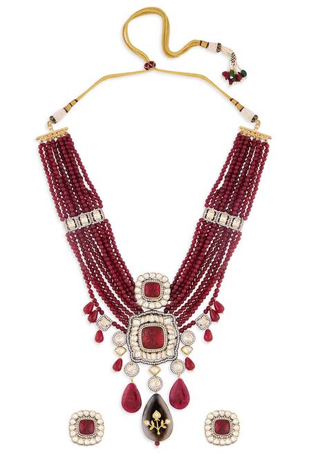 Red multi-layered bead necklace featuring onyx carvings, hydro polkis, and jade drops. Paired with matching stud earrings.
