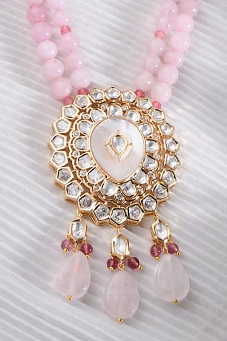 Central pendant with intricate kundan detailing, Pink bead strands with a gold finish, Drop embellishments featuring pink stones