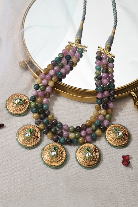 Gold finish choker necklace featuring encircled bloom engravings and multi-toned beads embellishments