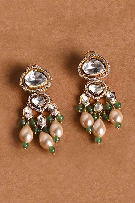 Gold earrings featuring a lotus design with pearl and green bead embellishments
