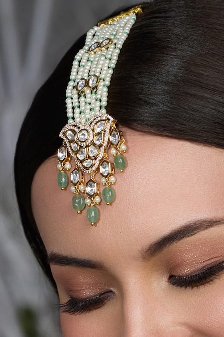 Floral-inspired detailing with sparkling gold stones, Multiple strands of white pearls & small green beads, Green bead drop embellishments