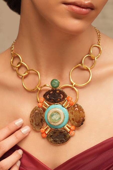 Gold finish necklace featuring a central turquoise stone surrounded by ornate brass detailing