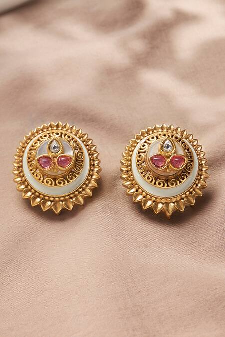 Gold stud earrings featuring carved round design with polki and kundan stones