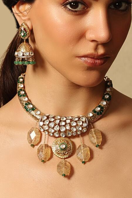Gold plating with intricate stone embellishments, Unique collar design with dangling elements