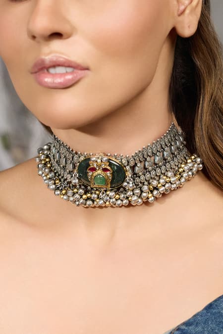 Vintage floral emblem with stone embellishments, Intricate detailing on oxidized silver, Gold-toned accents with silver beads