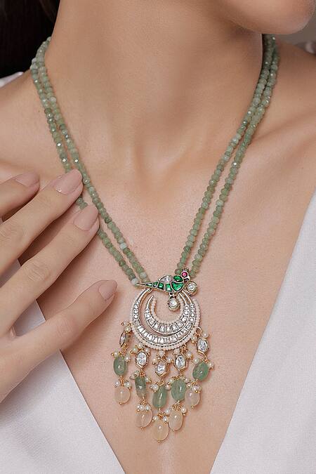 Gold finish crescent moon carved pendant necklace featuring beaded strings
