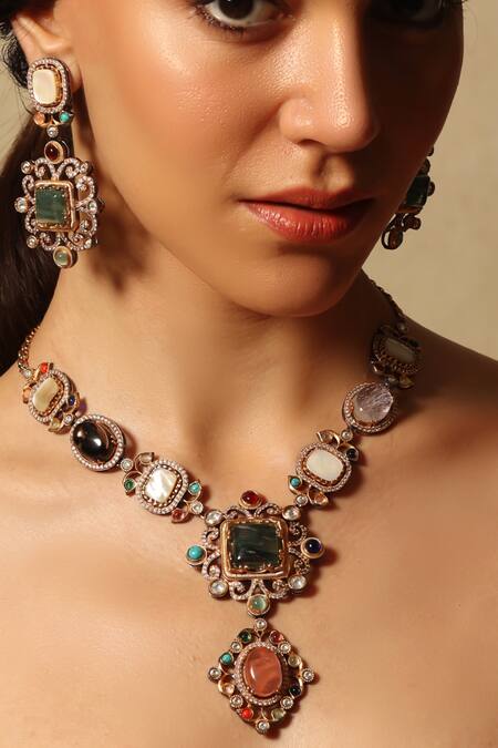 Multi-toned stone accents on necklace and earrings., Intricate gold finish detailing on the jewellery.