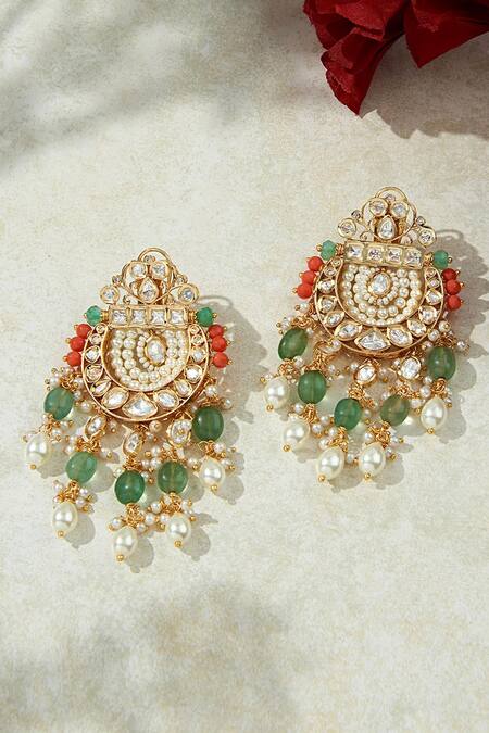 Gold finish dangler earrings featuring handcrafted multi-shaped polkis with pearl strings, corals, agates, quartz drops, and real semi-precious stones
