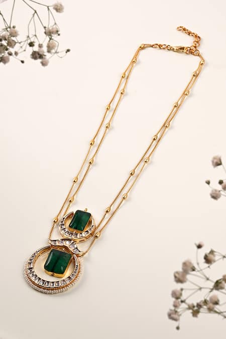 Gold plated layered necklace featuring kundan polki and green onyx embellishments with a geometric pattern